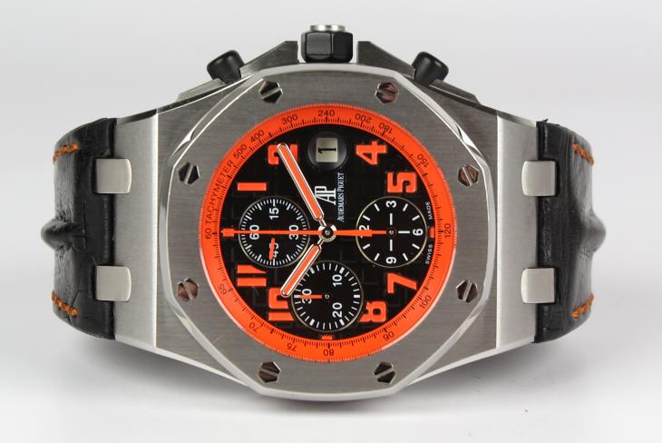 Et ur i den helt tunge ende, som er udført i meget flot finish. Uret måler 42 mm, og kommer med en meget lækker rem med orginal AP foldespænde. Uret er udført med orange detaljer, både på skiven og på remmen.
