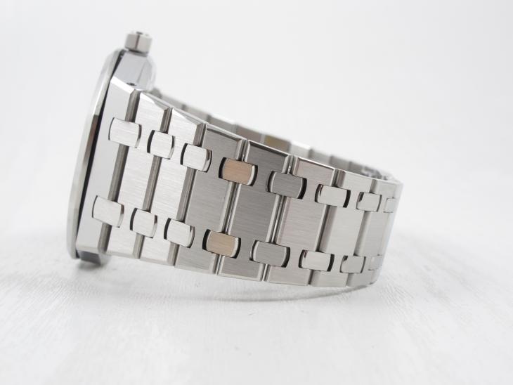 Rigtig flot ur fra Audemars Piguet i et utroligt højt finish. Uret er 15202ST modellen, som blot er 8.1mm tyk. Skive er hvid med AP's velkendte "Petite Tapisserie" mønster. På bagsiden ses det tynde cal. 2121 igennem safiren. Cal. 2121 var værket, som i en årrække var kendt som det tyndeste automatiske værk i verden. Lænken er afsluttet i en flot AP foldespænde. Uret måler 39mm og er med automatisk optræk.