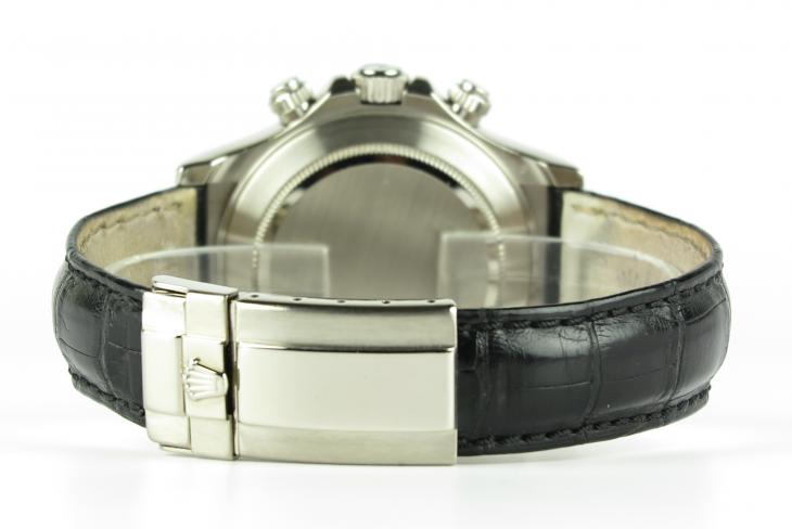 Rolex Daytona 116519 i hvidguld med panda dial, krokorem og hvidgulds foldespænde. Uret måler 40 mm og har automatisk optræk. Uret er serviceret i november månede 2015. Der følger service papirer med fra Klarlund. Uret er en P-serie