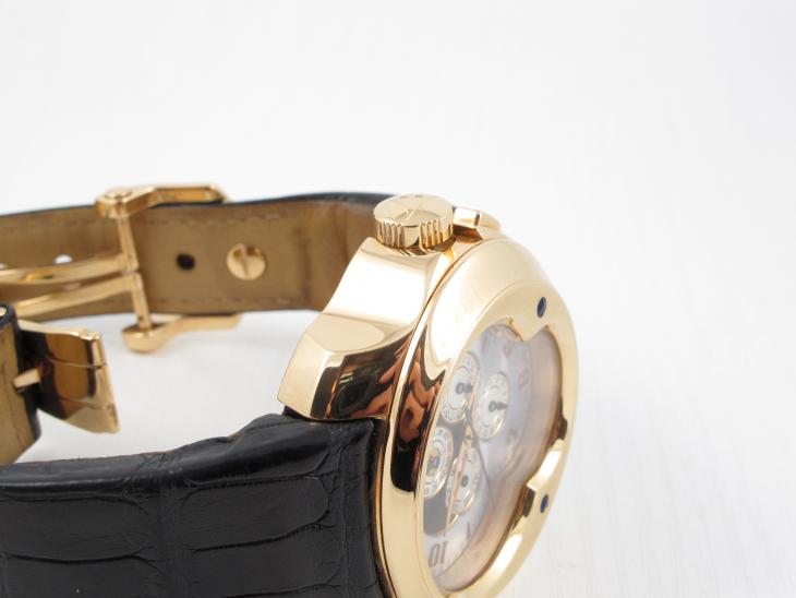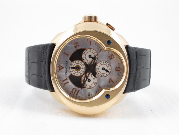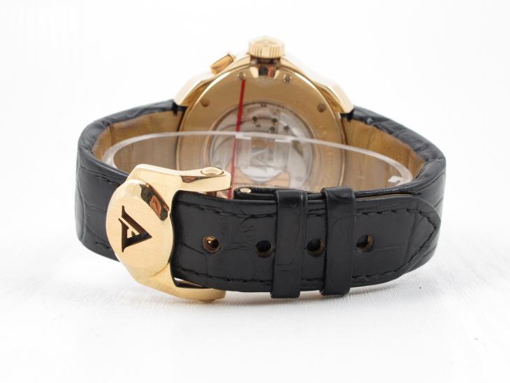 Her er muligheden for at få et 18K rose gold ur i den helt tunge ende som meget sjældent udbydes. Der er kun lavet 48 stk. af dem og dette bærer nummer 8. Stort ur med automatisk optræk. Kommer i en meget flot trækasse med indbygget watchwinder, samt ekstra gummirem. Vejl. nypris ligger i dag på ca. 450.000 kr og uret er stadig med delvis plastik på.