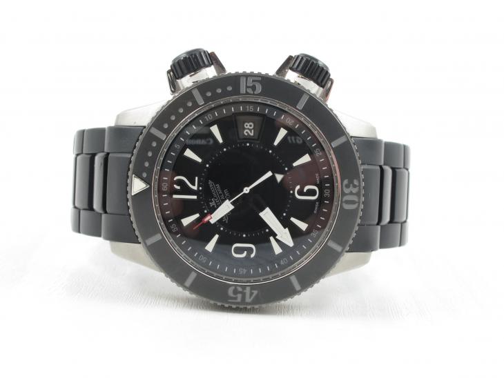 Super cool diver fra Jaeger-LeCoultre med mekanisk alarm - rigtig cool funktion. Uret måler 44 mm og er med automatisk optræk. Det er i titanium som god bærekomfort. Solgt fra DK forhandler og med original kvittering. Der er også en rem og spænde med (original JLC). Vejl. nypris ligger på ca. 87.000 kr.