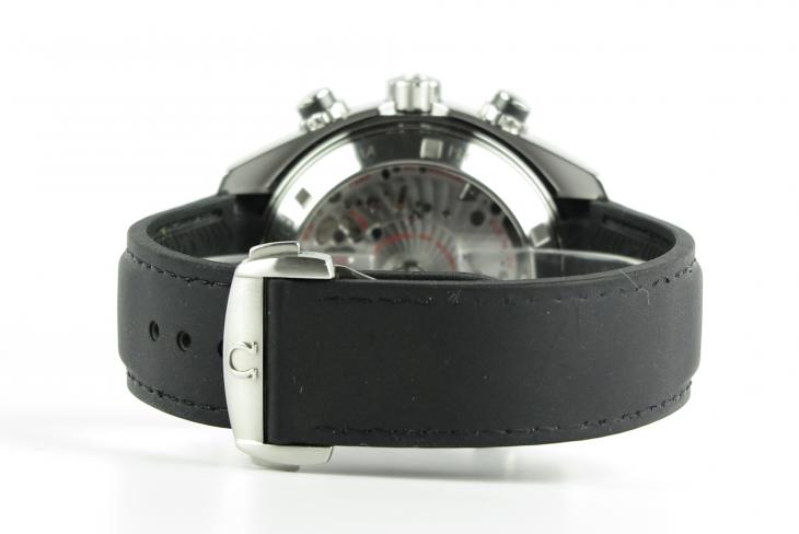 Omega Seamaster Planet Ocean 600m kronograf. Kassen måler 45,5 mm. 60 timers gangreserve samt kronograf funktion. Værket CO-axial kalibre 9300 kan ses gennem glasbagkasen. Uret er med automatisk optræk.