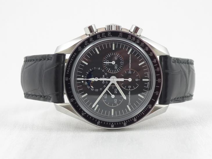 Mærke: Omega Model: Speedmaster Professional Moonphase Årgang: 2009 Tilbehør: Box, papir og certifikat Super fedt og klassisk ur fra Omega, det såkaldte "Moon Watch". Uret måler 42 mm og er med manual optræk. Denne model er med "Moonphase" - ref nr.: 3876.50.31 Uret kommer på en lækker cocrorem og foldespænde fra Omega. Det er solgt fra DK forhandler 2009. Vejl ny pris er 28.800 kr.