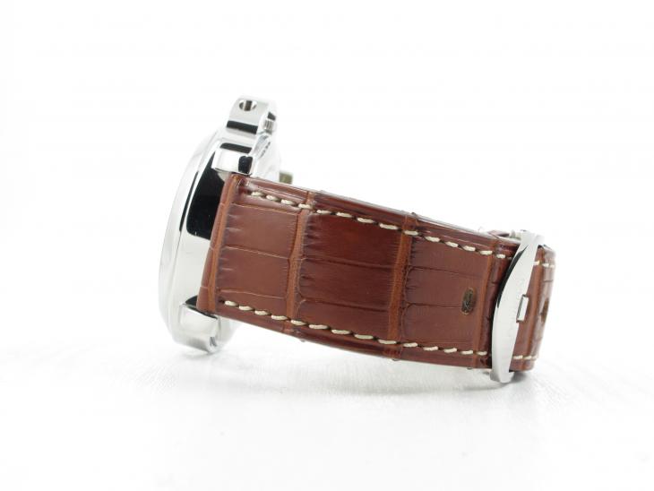Her er muligheden for at få et af de eftertragtede Panerai med fast bagkasse, som kun stiger i pris. Uret måler 44 mm og er i flot stand. Remmen er som ny. Der medfølger original Panerai gummirem.