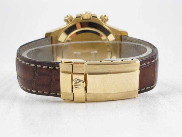 Rigtig smukt Daytona fra Rolex, i 18k guld, med hvid skive og floating dials. Uret er på orginal Rolex læderrem, med orginal 18k guld foldespænde. Uret måler 40mm og er med automatisk optræk. Uret er en Y-serie.