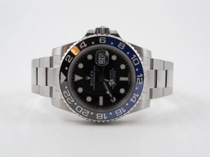 Sidste nye udgave af GMT Master med blå/sort lynette. Uret måler 40 mm og er med automatisk optræk. Helt nyt med plastik på. Spring ventelisten over, uret er på lager nu..!