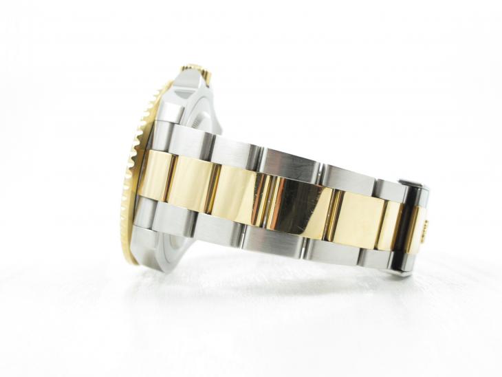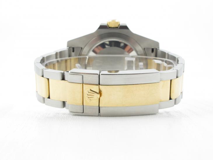 Nyeste model af Rolex GMT Master II i guld/stål. Uret måler 40 mm og er med automatisk optræk. Vejl. nypris er ca. 82.000 kr.