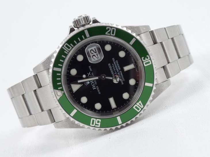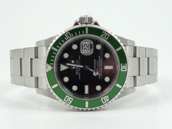 Mærke: Rolex Model: Submariner 16610LV Årgang: 2006 Tilbehør: Box, papir og certifikat Meget klassisk ur fra Rolex i fin stand. Uret er købt ved Klarlund i København. Uret måler 40 mm og er med automatisk optræk. Dette er LV modellen med grøn lynette. Uret har kun været i produktion fra 2004 til 2010, så på sigt vil det blive et rigtig samler ur.