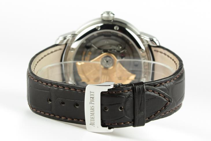 AP Millenary 4101 med krokorem og foldespænde. Uret måler 47 mm. Værket er et Cal. 4101 og udmærker sig ved sin 3D arkitektur som gør det muligt at se helt ind i værket. Gangreserven er på 60 timer Vejl. nypris er 202.000 kr