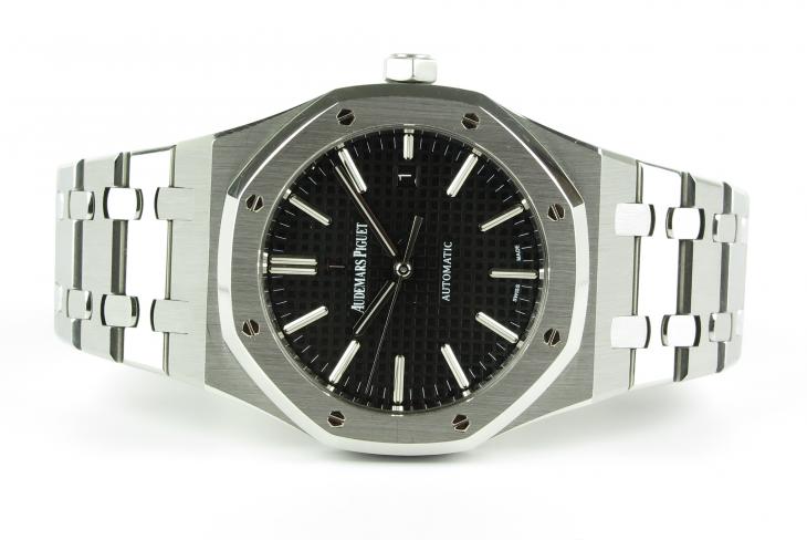 41 mm Audemars Piguet i børstet stål med automatisk in-house urvaerk 3120 med 40 juveler, 21600 vph og en gangreserve på 60 timer. Der er stadigvæk plastik på dele af uret. Komplet sæt.