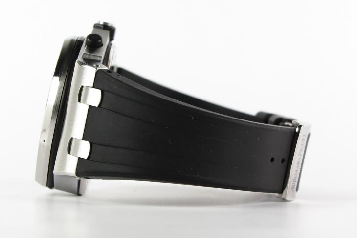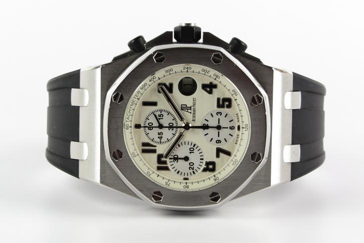Royal Oak Offshore med kronograf. Uret måler 42 mm. Værket er med automatisk optræk. Der medfølger AP læderrem. Komplet sæt.