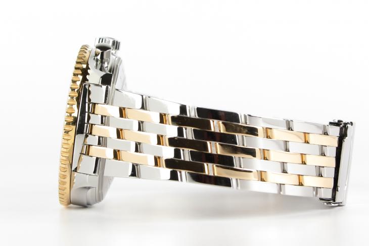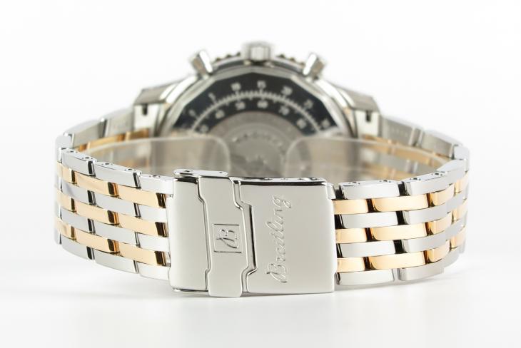42mm guld/stål Navitimer med blå skive. Uret har automatisk optræk. Den første navitimer blev produceret i 1952 og en klassiker, her i en eksklusiv version med guld/stål lænke.