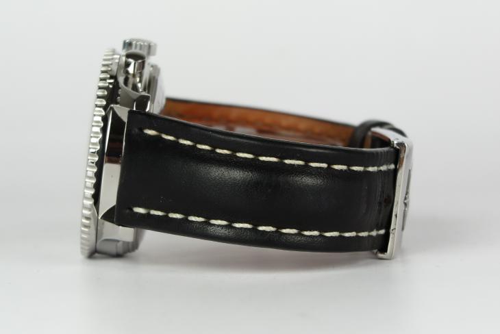 Super flot Breitling Navitimer med sort skive og flot sort læderrem. Uret måler 42 mm og er med automatisk optræk. NB.: Uret med danske papirer fra Hvelplund.