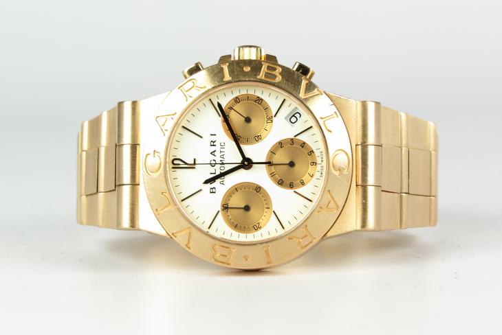 Flot chronograf fra Bvlgari udført i 18k guld. Uret er med boks og orginal kvittering fra Ole Mathiesen i København. Det måler 35mm og er med automatisk optræk. NB.: Uret er med dansk kvittering - Nypris: 121.250,- DKK
