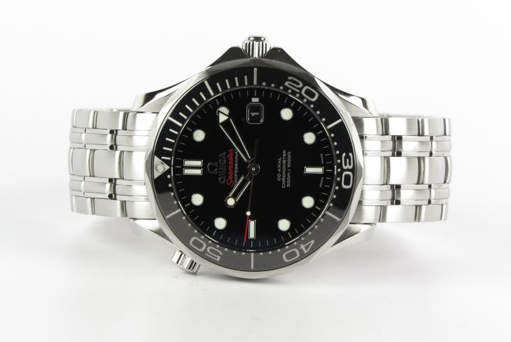 Klassisk Seamaster 300M med sort skive + lynette. Uret måler 41,5 mm og er med automatisk optræk.