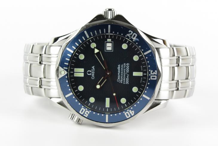 Fin Seamaster 300M med blå lynette/skive. Uret måler 41 mm og er med automatisk optræk. Har fået komplet service feb. 2019