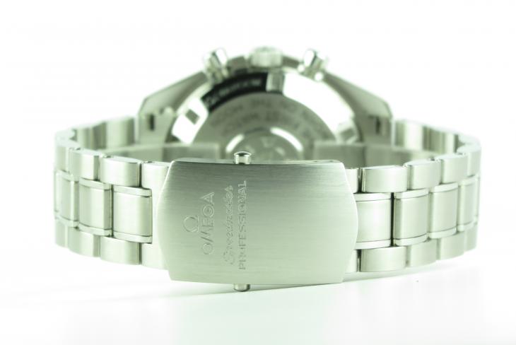 Klassisk 42 mm Speedmaster med pleksiglas og manuelt optræk. Uret har tilhørende papirer og boks, som i sig selv er et syn værd. Boksen indeholder bl.a. remme og lup mm. Uret er meget tæt på ny-stand.