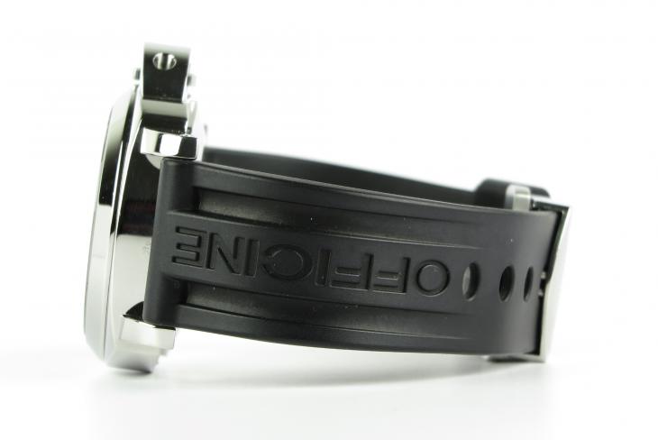 Pam 104 med gummirem og foldespænde. Uret måler 44 mm Værket er med automatisk optræk. Der medfølger service papirer fra 2013 og februar 2018.