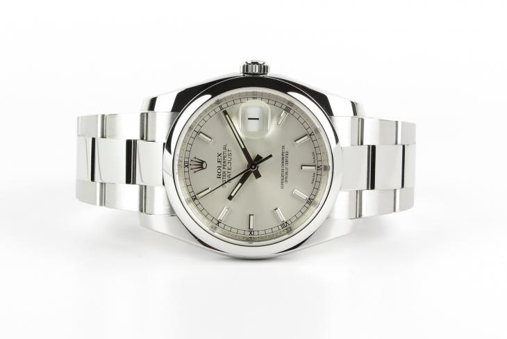 Datejust i stål med sølvfarvet skive og streg index. Uret måler 36 mm. Værket er med automatisk optræk. Der medfølger boks, papirer og certifikat (DK)