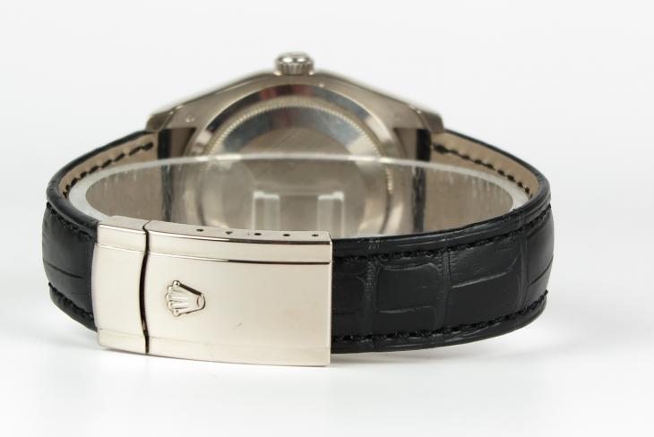 Super smukt Rolex Datejust i 18k hvidguld. Uret er med helt ny aligatorskinds rem til en værdi af 3150,- DKK Det er en F-serie med ROLEXROLEX i kransen. Uret nåler 36mm og er med automatisk optræk.