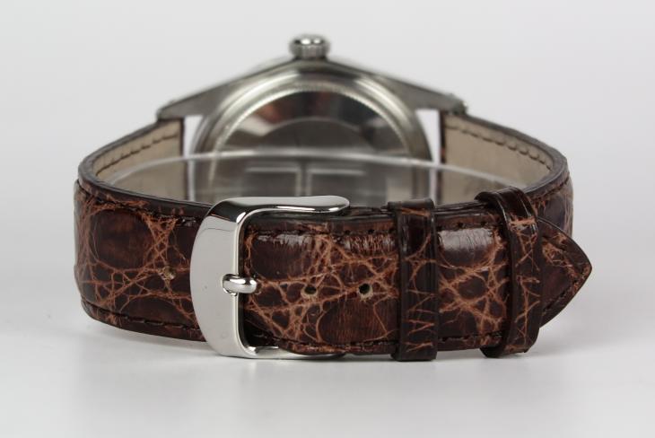 Et flot klassisk ur fra Rolex i pæn stand. Uret kommer med papirer og certifikat fra Knud Pedersen i Århus, steplet i 1983. Uret måler 36 mm og er med automatisk optræk. Uret har modtaget fuld service hos Rolex i 2013 (papirer medfølger).