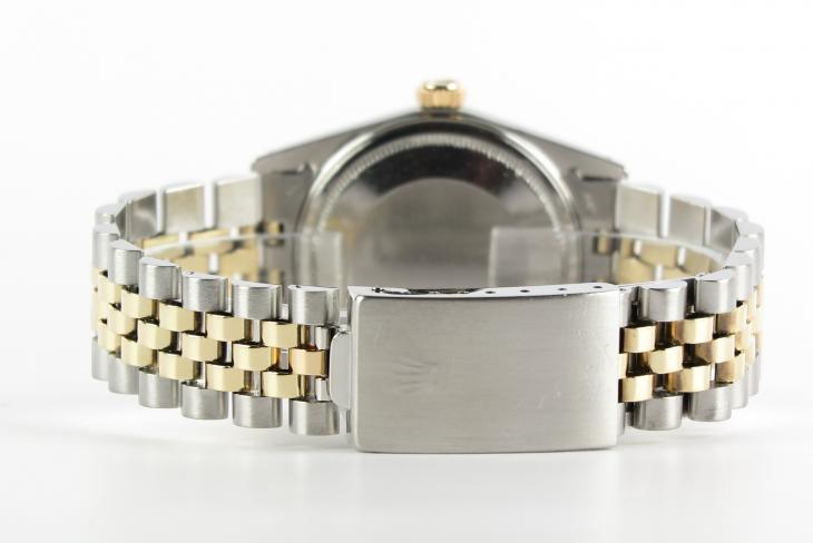 Vintage Rolex Datejust guld/stål. Uret måler 36 mm og er med automatisk optræk. Det er med plexiglas.