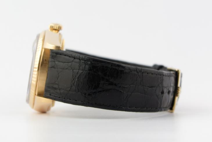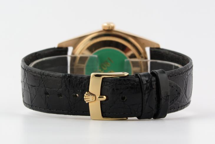 Flot Daydate 18 karat med sort skive. Uret måler 36 mm og er med automatisk optræk. Komplet service 2021.