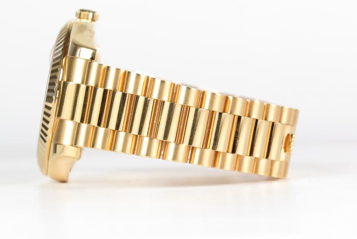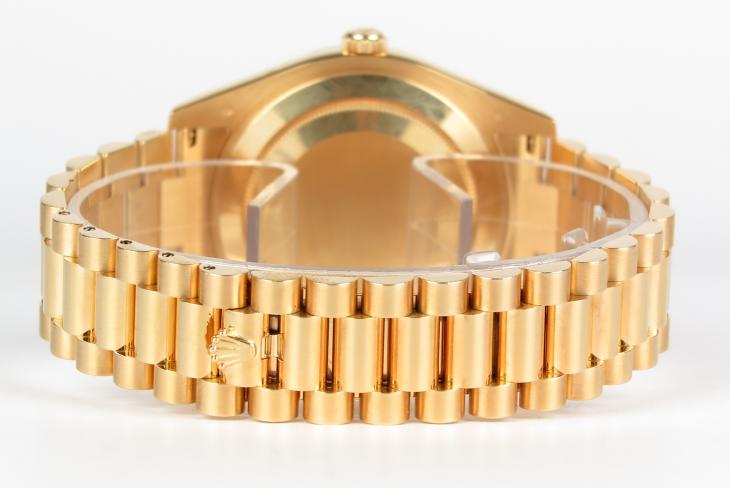 Utroligt smukt ur fra Rolex i den helt tunge ende - i rigtig fin stand. Champangeskiven er påsat med 8 diamanter og to baguette diamanter. Det er på 18k fuldgulds president lænke med 18k skjut foldespænde. Det måler 41mm og er med automatisk optræk. Uret kommer som komplet sæt med papirer fra Klarlund i København. Vejl. Nypris: 256.100,- DKK