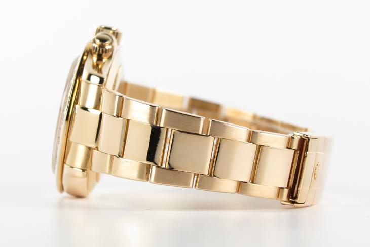 Daytona i 18 karat guld med brilliantskive. Uret måler 40 mm. Værket er med automatisk optræk. Uret er serviceret ved Rolex i maj 2018.