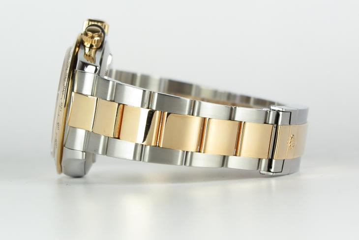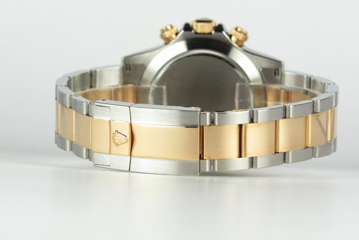 Klassisk Rolex Daytona i guld/stål med sort skive. Uret er i flot stand og komplet med boks, certifikat og papirer.