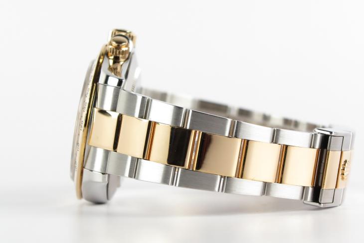 Flot Daytona i guld/stål udgave med sort skive. Uret måler 40 mm og er med automatisk optræk. Sættet er med boks, papir og certifikat fra Klarlund (12 mdr 2009). Nb.: Uret har fået komplet service august 2019.