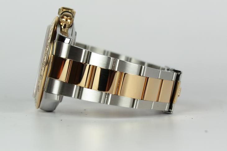 Super flot Rolex Daytona udført i guld og stål. Uret er med smuk sort skive og guldfarvede detaljer. Det måler 40mm og er med automatisk optræk Det er en M-serie med ROLEXROLEX i kransen.