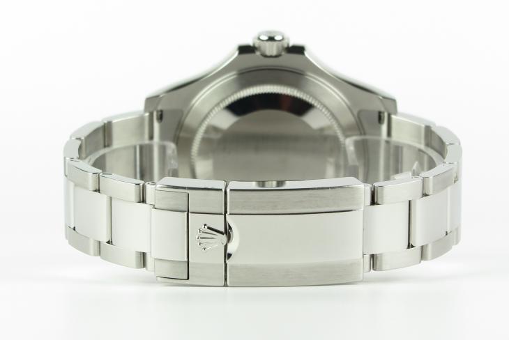 Rolex Yacht Master med sølv skive og plantin lynette. Uret måler 40 mm og har automatisk optræk. Sættet er komplet med boks, papirer og certifikat.