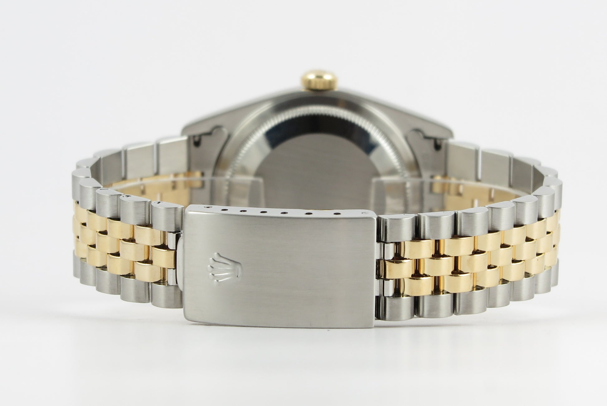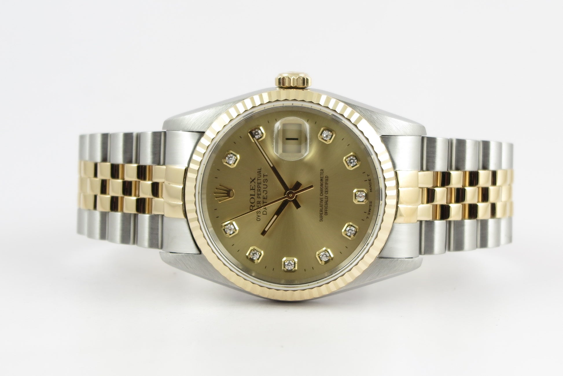 Flot klassisk Rolex Datejust i guld/stål med champagne skive med store diamanter.