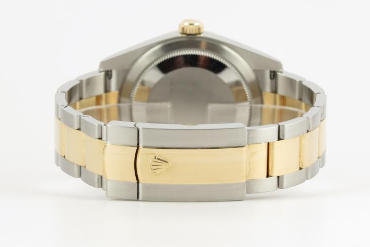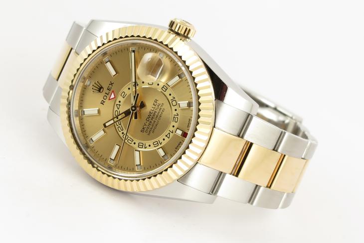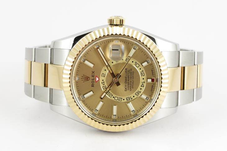 Sky-Dweller i guld/stål.Uret måler 42 mm.Værket er med automatisk optræk.Uret kan vise to tids zoner + visning for mdr.Kaliber 9001 (Rolex in-house)